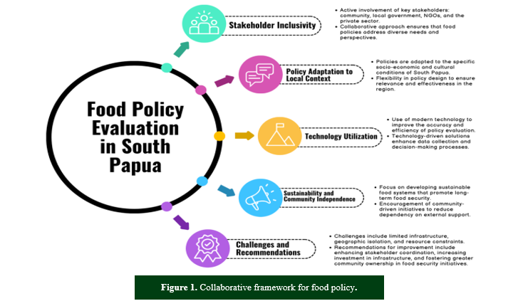 The figure 1 illustrates the collaborative framework among key stakeholders in food policy evaluation, including the community, local government, NGOs, and the private sector. Arrows connecting these entities show the flow of communication and decision-making, emphasizing the importance of cooperation in developing effective food policies. This research on food security policies in South Papua highlights key aspects such as increased stakeholder participation, policy adaptation to local contexts, the use of technology for accurate evaluation, and the focus on sustainability and community food independence. It also identifies challenges and provides recommendations for improvement, summarized in the Table 5.