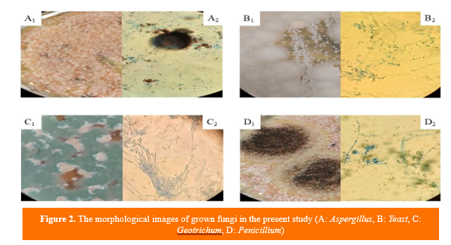 Regarding Geotrichum and Aspergillus fungi, results indicated that their prevalence in manual samples was 31.6% and 10.5%, respectively, whereas, in boiling method, Geotrichum was present at 11.6% and Aspergillus was not detected. Manual method showed a higher prevalence of Geotrichum, Penicillium, and Aspergillus compared to boiling method, while yeasts were more prevalent.
