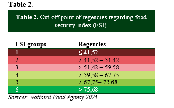The Food Security Index (FSI) is one approach to measuring the performance of food security development in a region based on several indicators used to produce a composite score of food security conditions (Sutrisno, 2022). FSI measures the achievement of food security development in a region, measures regional performance in fulfilling mandatory government affairs, and is one of the tools for determining regional development and program intervention priorities (Jakaria and Lutfi, 2022).