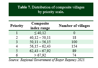 According to the results of a deeper analysis of the distribution of villages in priority two and priority three categories, several sub-districts in Bogor Regency have a high proportion of food-insecure and vulnerable villages. This condition indicates that based on the results of the FSVA analysis, the food-insecure and vulnerable villages dominate in these sub-districts. Table 8 shows that there are no less than seven sub-districts in Bogor Regency that have a proportion of prioritized food-insecure and vulnerable villages (priority 2 and 3) of more than 50%. Some of them have a proportion of more than 70%, such as in Kecamatan Cijeruk and Kecamatan Tamansari. Overall, almost all sub-districts in Bogor District (75%) have villages with priority 3 for food insecurity management. This condition needs attention to reduce the number of food-insecure and vulnerable villages.