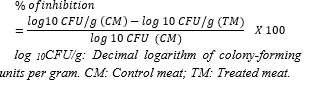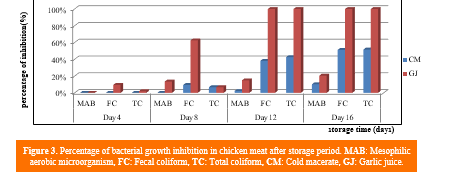 The raw material (chicken meat, weighing between 2.5–5 kg) was purchased from a local butcher and immediately transported to the laboratory in ice boxes. Chicken breast meat was randomly divided into three experimental groups as follows: T1 (Negative Control): No treatment applied, T2: Garlic juice at its minimum bactericidal concentration (MBC; 300 µl/ml) added per gram of breast meat; T3: Cold garlic macerate at its MBC (300 µl/ml) added per gram of breast meat. All samples were stored under refrigeration (4 °C) for a total of 16 days. Microbial counts, including total viable aerobic bacteria, total coliforms, and fecal coliforms, were performed at four-day intervals. At the end of the storage period, the percentage of microbial inhibition was calculated.