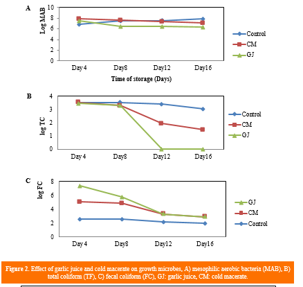 During the final period of storage (16 days), an increase in mesophilic aerobic microorganisms was noted. However, the garlic juice and cold macerate-supplemented treatments contained a statistically significantly low microbial load compared to the control, which registered 6.88 log10 CFU/g. A gradual decrease in the load is observed from the eighth to the sixteenth day of storage. Interestingly, garlic juice had a significant inhibitory effect on the growth of mesophilic aerobic microorganisms on day 4 of storage. Garlic juice and cold macerate were shown to reduce total coliform numbers compared to the control. This was especially evident with garlic juice, which had a total coliform load of 0 log10 CFU/g during storage (Figure 2). On the other hand, the cold macerate indicated a reduced inhibitory effect, with a microbial load of 1.95 log10 CFU/g in the storage period. Microbial load showed a very high decline on day 12 in the treatment. In addition, there was a notable variation in the mean counts of thermo-tolerant coliforms between the various treatments, determining the antimicrobial activity of garlic extracts during storage.