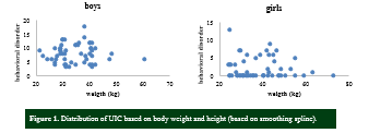 In this study, the correlation between urinary iodine and its variables including height, weight, and salts iodine is shown in Table 2. According to the analysis, there was little correlation between UIC and height as well as weight in both groups, so their trend of change has been negative with the height increasing (R=-0.09 in girls, R=-0.02 in boys). Thus, with less effect, higher iodine intake was found in taller individuals, while decreased iodine uptake was effective in reducing height in students. There was also a negative correlation between UIC and girls’ weight (R=-0.11). However, in the boy's group, urinary iodine can slightly increase only with weight gain (R=0.02).