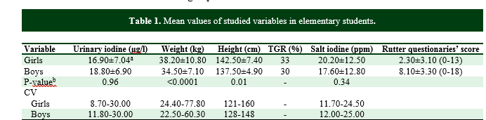 The mean of the studied indices in both groups is shown in Table 1. According to Table 1, the concentration of urinary iodine mean in girls and boys were 16.90±7.04 μg/l and 18.80±6.90 μg/l, respectively.