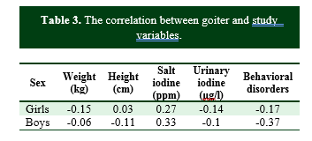 The correlation between goiter prevalence and independent variables as well as urine iodine was expressed in Table 3. Furthermore, the risk of goiter in girls decreased with increasing UIC (R=-0.14). However, there was a direct correlation between increased urinary iodine and increased risk of goiter in boys (R=0.1). Thus, it can be said that the use of iodine excretion as an indicator of goiter prevalence in boys is a little validity. In addition, iodine is another factor that has been effective in reducing the prevalence of goiter in both boys and girls (R=0.33 in boys, R=0.27 in girls). On the other hand, weight gain was another factor influencing goiter prevalence in girls (R=0.15) but no such correlation was observed for boys (Table 3).