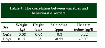 The association of behavioral disorders with independent variables such as weight, height and concentration of iodine in salt as well as the concentration of iodine in urine was expressed in Table 4. Statistical analysis showed there was the highest correlation between salt iodine concentration and reduction of behavioral disorders in boys (R=-0.55), while this relationship was not observed for girls. With increasing UIC in both groups, the total score of the questionnaire decreased slightly (R=-0.07 in boys, R=-0.22 in girls, Table 4).