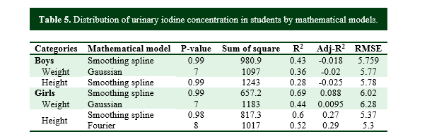 In previous studies, iodine deficiency has been dependent on living conditions (Xu et al., 2017). This was while according to the results of the present study, iodine deficiency disorders were similar in both sexes, which indicated no dependence on demographic characteristics and iodine salt concentration. Based on the statistical models studied, the UIC in boys had a normal distribution that was more correlated with the Gaussian model than other models. Similar results were observed for girls' UIC versus weight gain. But, the iodine concentration in girls follows the Fourier series, which indicates a repeated frequency of iodine concentration to height, and the highest correlation was observed in the eighth series (R2=0.52 and RMSE=5.3).