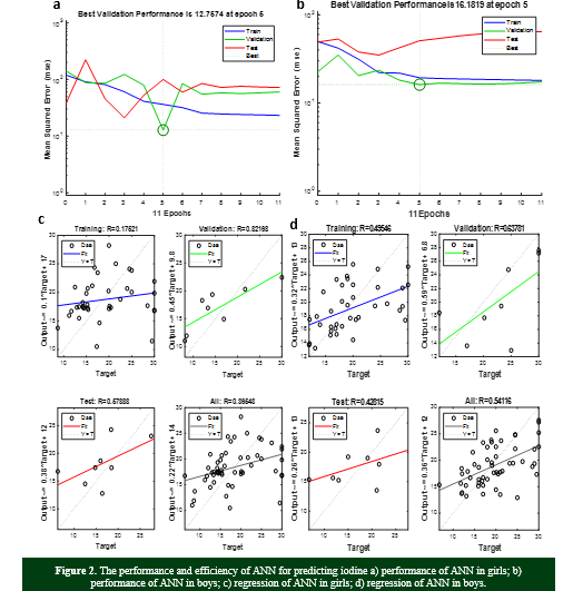 Thus, linear functions cannot predict changes in iodine concentration in these groups because the current method of determining the concentration of urinary iodine in behavioral disorders does not include all the numbers in a range. Due to these limitations, nonlinear models have been used to predict changes in the endpoints studied. The best artificial neural network structure for predicting UIC and behavioral disorders depend on independent parameters. The relationship between urinary iodine concentration (UIC), salt iodine concentration, height, weight, and behavioral disorders was analyzed using an artificial neural network model. The modeling results, which employed the Levenberg-Marquardt algorithm, indicated that for girls, UIC and behavioral disorders could be predicted with configurations of 3-8 neurons and 4-10 neurons in the hidden layer, respectively. Specifically, the results were 3:7:1 for UIC and 4:5:1 for behavioral disorders. The relationship between urinary iodine concentration (UIC), salt iodine concentration, height, weight, and behavioral disorders was analyzed using an artificial neural network model. The modeling results, which employed the Levenberg-Marquardt algorithm, indicated that for girls, UIC and behavioral disorders could be predicted with configurations of 3-8 neurons and 4-10 neurons in the hidden layer, respectively. Specifically, the results were 3:7:1 for UIC and 4:5:1 for behavioral disorders. MSE was lower than average in girls and boys, but the correlation was higher for boys (R=0.54). Thus, UIC in boys can be predicted with greater confidence by ANN. Although in previous studies the rate of iodine deficiency in pregnant women has been well predicted by the ANN as an iodized salt-dependent outcome (Murillo-Llorente et al., 2020), such strong relationships have not been found in this study. These results can be due to differences in the physical condition and nutrition of these groups. Consequently, the variables examined in this study, including weight, height, and the iodine concentration of salt alone, are insufficient to accurately predict iodine levels, which serves as a measure of iodine deficiency. On the other hand, the rate of MSE error for predicting behavioral disorders in girls was higher than average. However, according to the existing correlation coefficient, the prediction of behavioral disorders by the artificial neural network may be satisfactory in some cases (Abbasi et al., 2021).The results showed the limited ability of this nonlinear model to predict both endpoints, especially iodine concentration using independent variables. Thus, it is suggested that further studies be conducted on the effect of other parameters regarding iodine concentration and disorders.